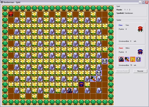 Hier (1.2 MB) gibt es mein Vordiplomsprogramm. Es ist das altbekannte Spiel "Bomberman". Zusätzlich zum Spiel gibt es noch ein Programmier- und Benutzerhandbuch (2.8 MB).